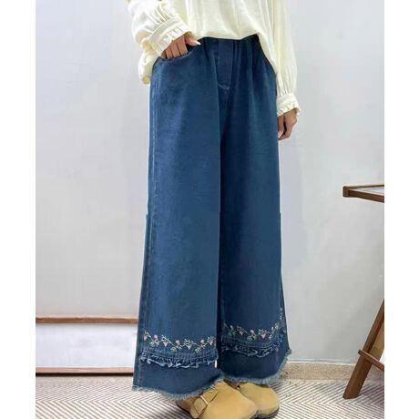デニム素材に花刺繍とフリルのディテールが施された、可愛らしくも大人っぽいデザインのパンツです。ウエストゴムで、ストレスフリーな着心地のイージーデザイン。カジュアルなコーディネートから、少しおしゃれなスタイルまで幅広く対応します。