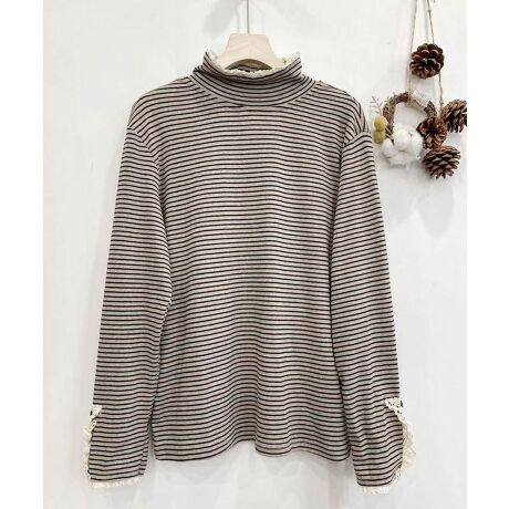 クラシックなボーダーパターンのタートルネックトップス。襟と袖口にはフリルをあしらい、女性らしい柔らかな印象をプラスしました。程よく体にフィットするシルエットで、インナーとしても単独でも着こなせる万能アイテムです。秋冬のコーディネートに華やかさを添えます。