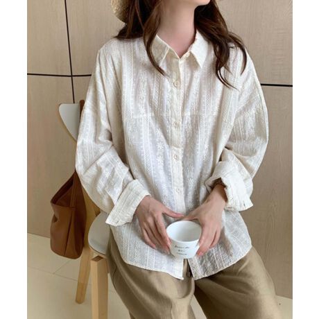 繊細な刺繍が施されたエンブロイダリーレースのシャツです。クラシカルなデザインのシャツに上品な刺繍レースが加わり、シンプルなのに華やかな印象を与えます。ゆったりとしたシルエットがリラックス感があり、袖をロールアップすると軽快な着こなしに。フロントボタン仕様でTシャツの上に羽織るのもオススメです。