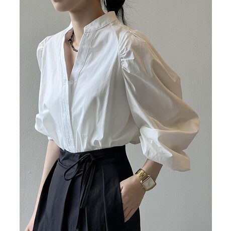 シンプルでエレガントなVネックデザインのブラウスです。デコルテが綺麗に見えるネックラインとゆったりとした袖のボリューム感が女性らしさを引き立てます。フロントのボタンディテールがアクセントとなり、日常使いからオフィスまで幅広く活躍する一枚です。