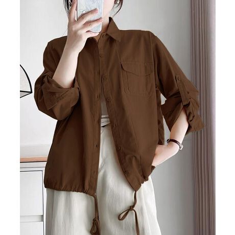 大きなフラップポケットがアクセントとなったロールアップベルト付きのコットンシャツです。リラックス感のあるシルエットで、日常のカジュアルコーディネートにぴったりです。肩部分にややゆとりを持たせており、動きやすさも重視されたデザインです。裾は紐で調節出来るので幅広い着こなしが楽しめます。