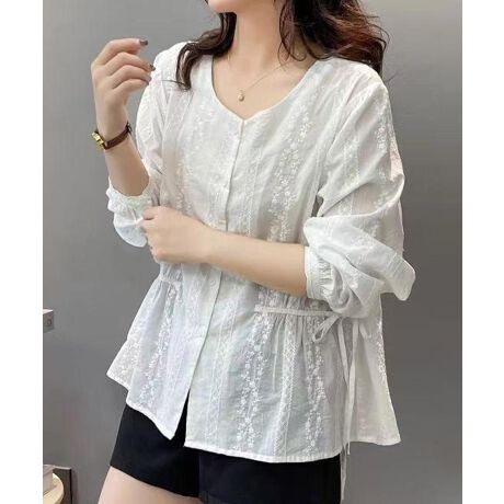 優雅な花柄刺繍とウエスト部分に施されたギャザーが特徴のシャツブラウスです。シンプルなデザインの中に、女性らしいシルエットを作り出すギャザーがポイントです。ウエストマークされているのでスタイル良く着こなせます。カジュアルでエレガントな印象を与えます。
