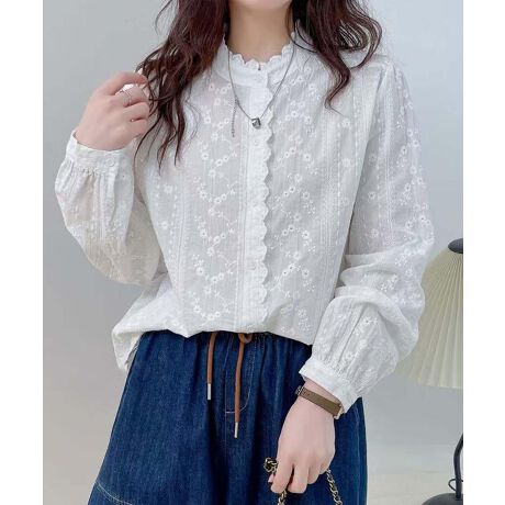 フリル襟と繊細な花柄刺繍が施されたレーシーなシャツです。前立てのレースのディテールが、エレガントで女性らしさを引き立てます。袖口も柔らかく、ふんわりとしていて、全体的に優雅さと可愛らしさのあるデザインです。