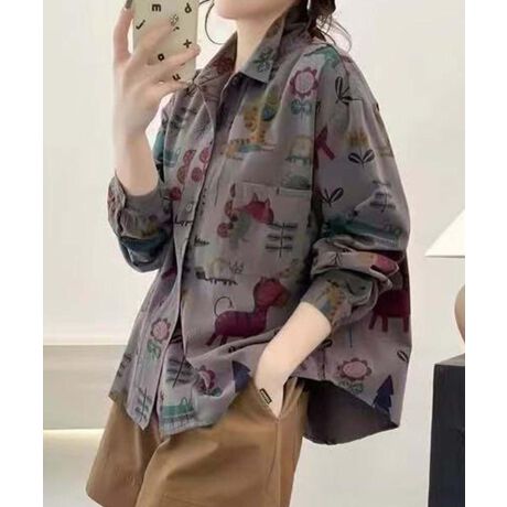 様々なモチーフのプリント柄が特徴的な長袖オーバーシャツです。ゆったりとしたシルエットで、リラックス感のある着心地。カジュアルスタイルにぴったりのアイテムです。
