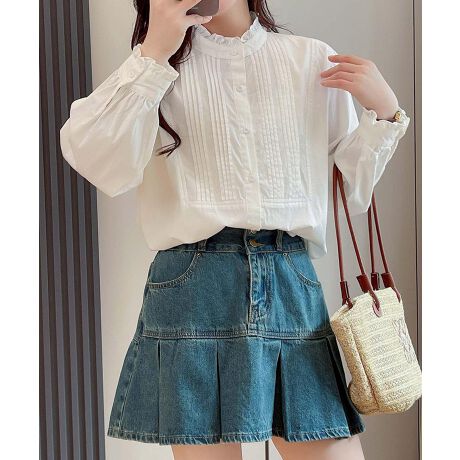 ピンタックとフリルがフェミニンな印象の長袖シャツです。フリル襟が首元をすっきりさせ、甘すぎない上品なスタイルに。袖口にもフリルをあしらい、細部までこだわったデザインが魅力です。