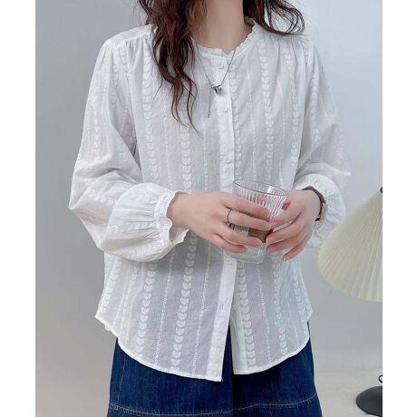シンプルなデザインの中に、花柄刺繍と袖裾のスカラップレースが際立つシャツブラウスです。フリル襟と刺繍がカジュアルでありながらエレガントな印象を作り出します。袖口はスカラップレースをあしらっていて、着心地も抜群です。