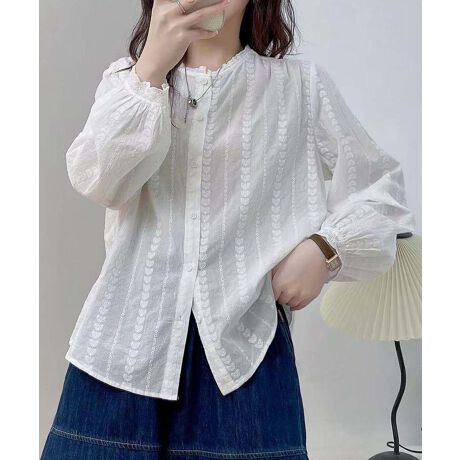 シンプルなデザインの中に、花柄刺繍と袖裾のスカラップレースが際立つシャツブラウスです。フリル襟と刺繍がカジュアルでありながらエレガントな印象を作り出します。袖口はスカラップレースをあしらっていて、着心地も抜群です。