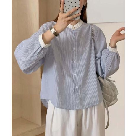 バンドカラーが特徴的な長袖シャツです。袖のボリューム感がフェミニンな印象をプラスし、トレンド感のあるデザインに仕上がっています。前開きのデザインで、羽織りとしても着用できる着回し力の高いアイテムです。