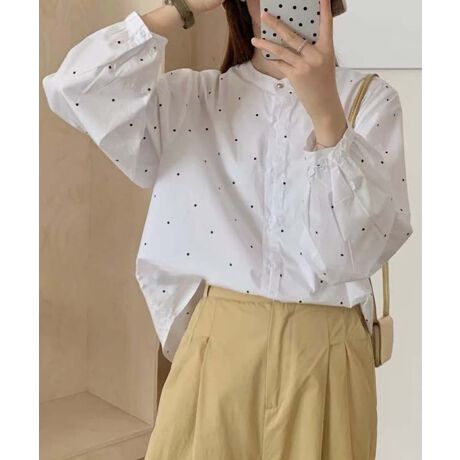 バンドカラーが特徴的な長袖シャツです。袖のボリューム感がフェミニンな印象をプラスし、トレンド感のあるデザインに仕上がっています。前開きのデザインで、羽織りとしても着用できる着回し力の高いアイテムです。