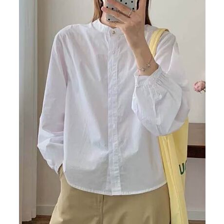 バンドカラーが特徴的な長袖シャツです。袖のボリューム感がフェミニンな印象をプラスし、トレンド感のあるデザインに仕上がっています。前開きのデザインで、羽織りとしても着用できる着回し力の高いアイテムです。