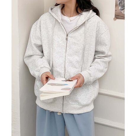 シンプルでありながらも、フロントにジッパーが施されたフード付きパーカー。日常使いにぴったりなカジュアルアイテムです。フード付きで季節の変わり目にぴったり。