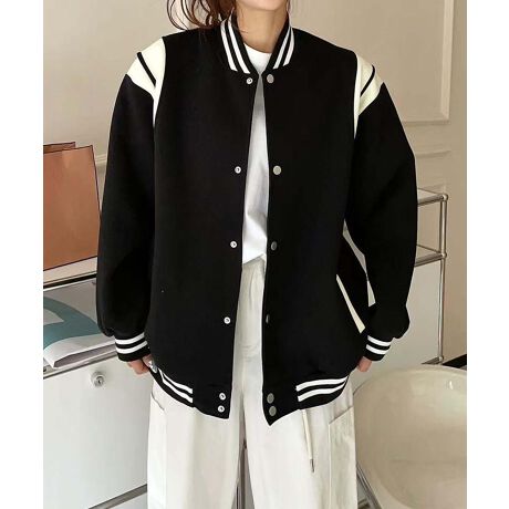 スポーティーなリブデザインが特徴のスタジャン。袖と裾のリブがアクセントとなり、全体的にスタイリッシュでありながらカジュアルな印象に。フロントにはボタンが施され、シンプルながらもデザイン性の高いアイテムです。