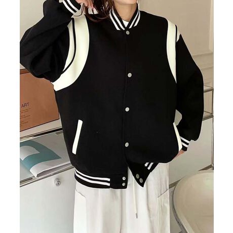 スポーティーなリブデザインが特徴のスタジャン。袖と裾のリブがアクセントとなり、全体的にスタイリッシュでありながらカジュアルな印象に。フロントにはボタンが施され、シンプルながらもデザイン性の高いアイテムです。