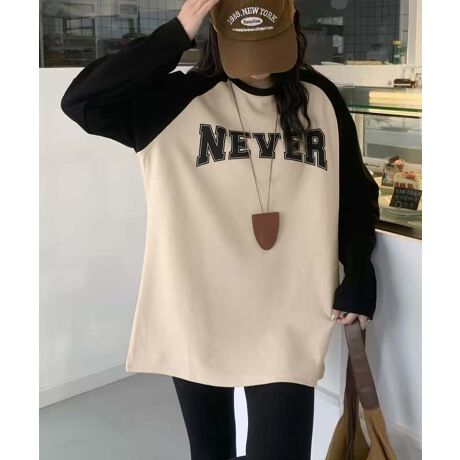 フロントに大きな「NEVER」のロゴプリントが特徴的なラグランスリーブ長袖Tシャツ。異なる色の袖がアクセントとなり、シンプルでありながらも印象的なデザインです。ゆったりとしたシルエットで、カジュアルスタイルにぴったりです。