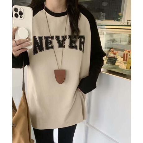 フロントに大きな「NEVER」のロゴプリントが特徴的なラグランスリーブ長袖Tシャツ。異なる色の袖がアクセントとなり、シンプルでありながらも印象的なデザインです。ゆったりとしたシルエットで、カジュアルスタイルにぴったりです。