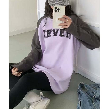 フロントに大きな「NEVER」のロゴプリントが特徴的なラグランスリーブ長袖Tシャツ。異なる色の袖がアクセントとなり、シンプルでありながらも印象的なデザインです。ゆったりとしたシルエットで、カジュアルスタイルにぴったりです。