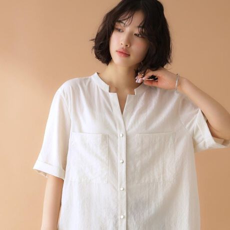 タンブラー加工を施した素材感が魅力のスキッパーシャツで、金釦のWポケットデザインが特徴です。