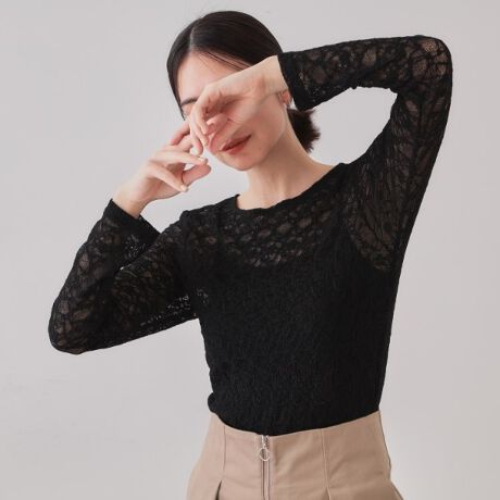 ・シアーのレースがフェミニンさをプラスしてくれるシンプルレーストップスです。