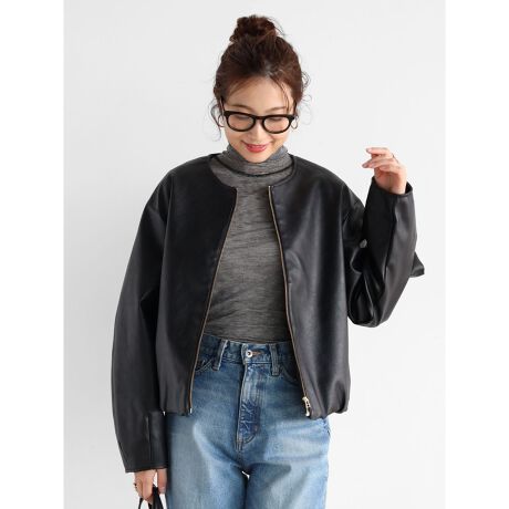 バルーンシルエットでハードな印象のレザーを女性らしい雰囲気に仕上げた1枚。