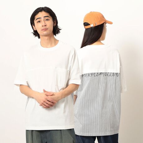 毎年人気の布帛切り替えバックプリントTシャツが新たにストライプと無地の生地使いになって登場します。