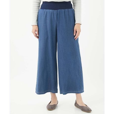 再生繊維(セルロース)混の素材は、エコフレンドリーで今季は新しいフリクションデニム素材です。やわらかな風合いと適度な光沢感があり、繊維がやわらかいためドレープ性があり、吸湿性にも富んでいます。インディゴを使用しているので洗い加工を施し、適度なアタリとウォッシュ感で上品な印象に仕上げました。ウエスト部分にはジャージ素材を使用しています。