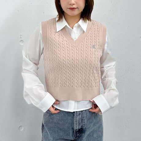 ベストはケーブル編み+胸元のワンポイントロゴ入り。