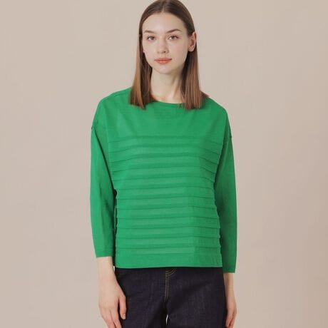 糸の特性を生かした透け感のある天竺組織と袋編みとの編地切り替えによりボーダーを表現したプルオーバーです。ゆったりとしたリラックスボディに控え目なボートネックと袖は八分丈で軽快な印象に仕上げています。