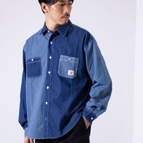 デニムとストライプの生地切り換えが目を惹くレギュラーカラーシャツ