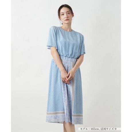 エレガントなスカーフ柄が魅力のワンピース。ウエストがフィットした仕様で快適な着心地とスタイルアップ効果。軽やかなフレアシルエットが女性らしさを引き立てる一着。
