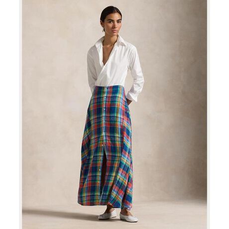 リネンで織り上げ、糸染めでマドラス風のチェック柄モチーフを表現したマキシスカート。流れるようなAラインのシルエットを引き立てるプリンセスラインが特徴・Aラインのシルエット / くるぶし丈・フロントにボタン付き・サイドシームポケット・前後にプリンセスライン / 裏地なし・モデル身長178cm、着用サイズ4※商品の色味は、光のあたり具合など諸条件により色感が多少異なって見える場合がございますので予めご了承下さい。※注意:柄の配置は、商品によって異なります。 【素材】・本体:麻 100%【生産国】インド