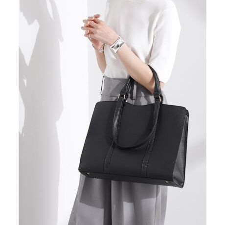 キレイめなデザインでノートPCやB4サイズが入るトートバッグ。オフィスシーンや通勤に重宝するサイズ感と合成皮革の上品な質感が魅力のポイント。トレンドに左右されないシンプルなルックスで長年愛用頂ける一品です。