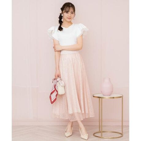 スパンコールがきらめく一目惚れチュールフレアスカート【Design】・軽やかに広がるチュールフレアが高揚感を高める春の新作スカート。・透明感のあるチュール素材にスパンコールとラメ糸をあしらい、上品な雰囲気に◎・ベルト幅を広めに用意し、脚長効果&トップスをスッキリとウエストインしていただけます。・ウエストバックはゴム仕様、左ファスナー仕様なので、着脱ぎも楽にできるのも嬉しいポイント♪・ブラウスをあわせてフェミニンなスタイリングにしたり、Tシャツを合わせてカジュアルMIXで着こなすのもおすすめ◎・涼し気な雰囲気も併せ持っているので、夏までロングシーズンご使用いただけます。【Fabric】・表地はオリジナルプリントを施したシアー素材を使用。・同系色を使用したハリのある裏地付き。・ご自宅でお手入れが出来るのも嬉しいポイント♪・エクリュ、ピンク、サックス、ブラックの4色展開となります。【Care】手洗い可能