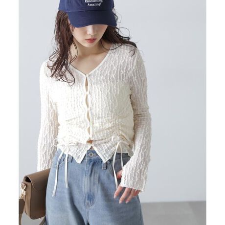 カーディガンとしても使える総レース素材のトップス。フロント切替部分にドロストギャザーを施し、バレエコアなディテールをプラス。Vネックと袖口のスリットで抜け感を出し、1枚で様になるデザインです。程よいフィット感でスタイルアップして見えます。デニム合わせで韓国っぽい着こなしが叶います。カップ付きインナーとレイヤードして、下のボタンを1つ外して着るのがおすすめ!※モデルの着用画像の場合、光の当たり具合により、実際の色味と異なって見えることがございます。色味は、商品単体の画像をご参照ください。