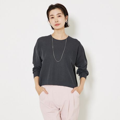 [型番:32500040003]*Detail*細番手のコットン混素材とナイロン糸を組み合わせ、程よい厚みと肌離れの良さを兼ね備えた上質なニット。シンプルながらも洗練されたデザインで、滑らかな質感が魅力の1枚です。*Coordinate*1枚でさらりと着ても上品な印象に仕上がり、ジャケットやカーディガンのインナーとしても活躍。ワイドパンツやタイトスカートと合わせて、カジュアルからキレイめまで幅広く着こなせます。