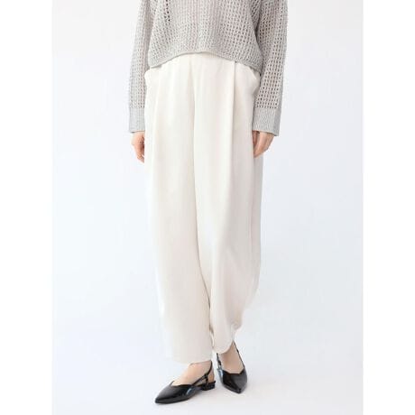 カーブラインから流れるようなドレープの落ち感が美しいコクーンワイドパンツ。後ろウエストのみにゴムを組み込み、膨らみを抑えることで腰回りをすっきり見せ、コクーンの膨らみを美しく引き立たせてくれます。ドレープ感がある素材のためトレンドのカーブシルエットでもカジュアルになりすぎず、大人の洗練されたスタイルを演出。シンプルながら上質なパンツは、どんなアイテムともマッチする万能アイテムです。
