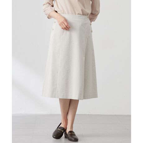 ■デザインAラインの履きやすい丈感の大人カジュアルなスカート。前にアシメのプリーツを入れる事で足捌きを良くしています。両端に同色系の釦ディティールを入れたデザインにしています。カットソーやニットを合わせてカジュアルに、ブラウスを合わせて上品にと着回し抜群のアイテムです。裏なしです。