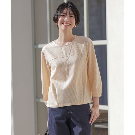 シンプルなクルーネックで、合わせるアイテムを選ばないプルオーバータイプのストライプ柄カットソー。前身頃に切り替えデザインを施し、シンプルでありながらさりげないアクセントをプラスしました。袖や裾部分にタックを入れてあるため、着用すると程よく立体的なシルエットになり、体のラインをカバーしてくれます。一枚着としてはもちろん、肌寒い時期はアウターのインナーとしても使いやすく、繊細なストライプ柄がコートインに映えるアイテムです。