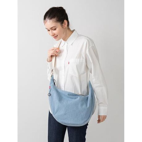 ライトインディゴカラーに同色の刺繍ロゴを配したデザインの・マークのショルダーバッグ。13Lの容量で必需品を十分に収納可能なサイズです。外側にもポケットを配しており小物をサラッと入れることも出来ます。どの季節にも持っていると便利なアイテムです。