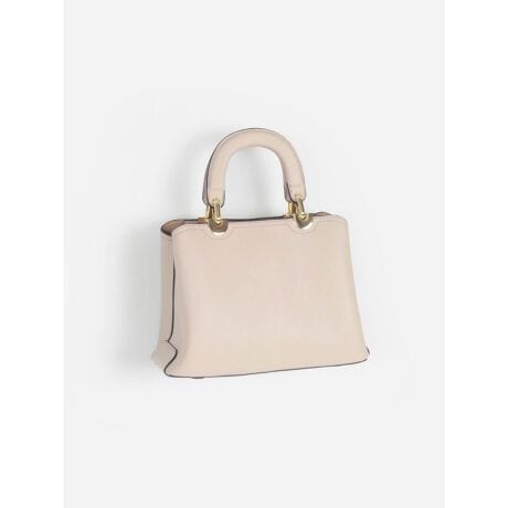 バイカラーパイピングの縁取りが、デザインに華を添えるエコレザーのハンドバッグ。