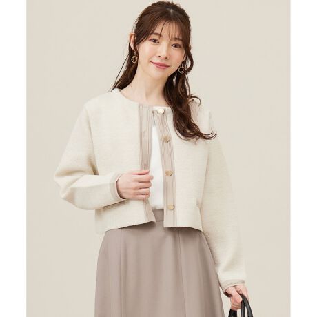 ・ブークレ糸特有の表面の凹凸感と繊細な光沢のラメが上品・カジュアルにもきれいめにも合わせやすく幅広いスタイリングに活躍・程よい厚みがありつつも軽い・ジャケット感覚で羽織れてコーディネートが華やかに