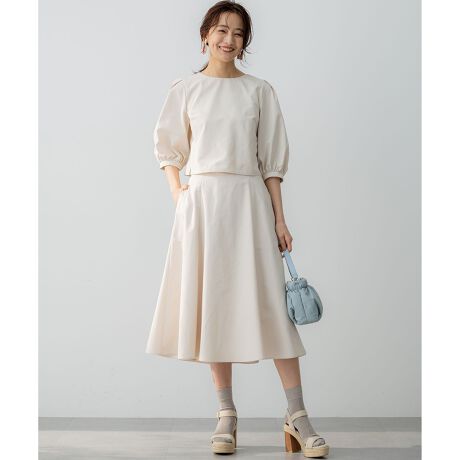 ■デザイントレンドのクロップド丈のトップスは、袖の立体的なボリューム感がポイントです。生地のハリ感を生かしながらふくらみを調整し、七分丈にすることで抜け感もあり、トレンド感もあるクラシックな雰囲気です。セットのスカートはハイウエスト仕立てで、クロップド丈のトップスと相性抜群です。生地のハリ感を生かした綺麗なフレアーシルエットのスカートは、1枚でも着回しが効く万能アイテムです。トップスと合わせてレディライクに決まる便利なセットアップです。