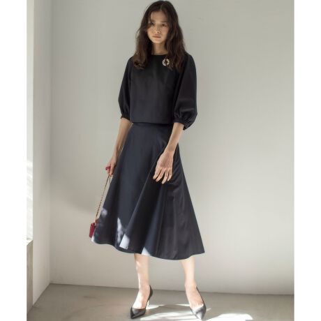 ■デザイントレンドのクロップド丈のトップスは、袖の立体的なボリューム感がポイントです。生地のハリ感を生かしながらふくらみを調整し、七分丈にすることで抜け感もあり、トレンド感もあるクラシックな雰囲気です。セットのスカートはハイウエスト仕立てで、クロップド丈のトップスと相性抜群です。生地のハリ感を生かした綺麗なフレアーシルエットのスカートは、1枚でも着回しが効く万能アイテムです。トップスと合わせてレディライクに決まる便利なセットアップです。