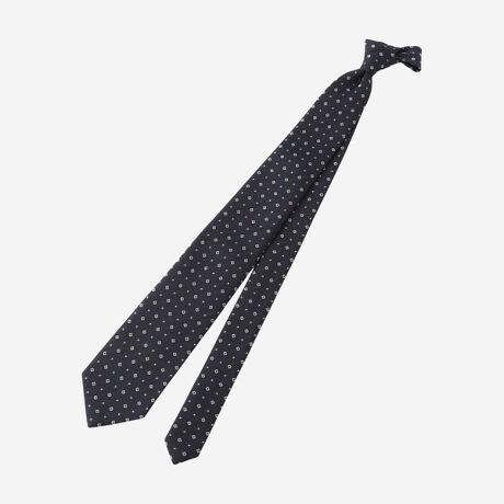糸の風合いと光沢、発色を活かす為、敢えて扱いの難しい甘撚りの糸を使用し、低速の織機で時間をかけて織り上げた小紋柄です。綾のベースにサテンのモチーフを飛ばし、クラシックな柄をジャガードならではの表現で立体感を持たせています。結びシワからの回復力に優れた、ウール100%のダブルクロスを芯に使用しています。京丹後産地の製品です。