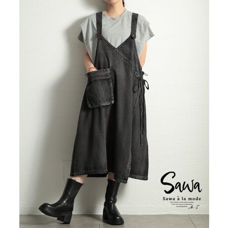 ヴィンテージムード漂うデニム生地が、こなれるカジュアルスタイルに仕上げてくれるジャンパースカート。ざっくりと開いた首元でお顔周りもすっきり見え。V字の胸元で大人っぽさをプラスします。アシンメトリーなラップ風デザインや、大きなポケット、リボン紐など、こなれるアクセントを詰め込んだ遊び心感じるワンピース。ウエスト部分の両サイドにはドロストを採用し、アームホール部分を絞ることでシルエットの変化を楽しめます。ゆったりとしたサイズ感に、広いアームホールでレイヤードも楽々。通年着こなせるアイテムだから、季節ごとのお気に入りスタイリングを見つけてみて。