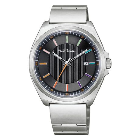 縦のストライプをセンターに描いた文字板に、ポール・スミスを象徴するマルチカラーのインデックスをレイアウト。