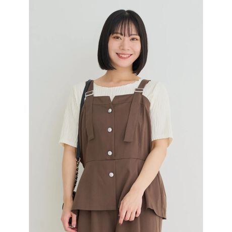 他にもワンピやベスト、ビスチェ、ジレのインナー遣いにと様々なアイテムと合わせやすい万能トップスです。
