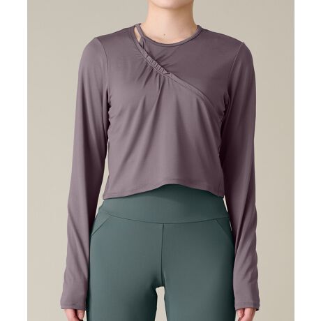 ■体のラインを拾わない程度の適度なゆとりがある、すっきリとしたサイズ感のロングスーブトップ