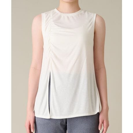 ■キラリと光る箔プリントと前身頃のシャーリングがポイントのスリーブレストップ