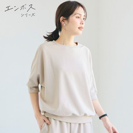 ドルマンシルエットがリラクシーなエンボス5分袖トップス