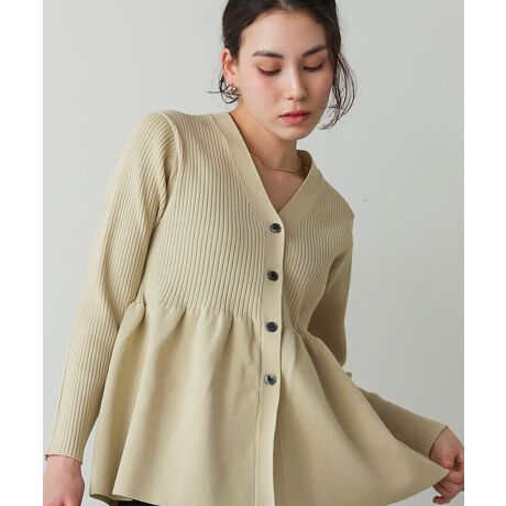 膨らみとストレッチのある糸で編んだニットカーディガン。軽さと立体感のある糸で仕立てているので、トレンド感のあるペプラムシルエットが美しく広がります。ややハイウエストからのペプラムシルエットなので、スタイルアップして見せてくれます。気になるお腹周りもさりげなく隠してくれるのも嬉しいポイント。前を閉めてトップスとして着ても、前開きにして軽羽織として使うのも◎